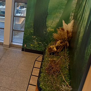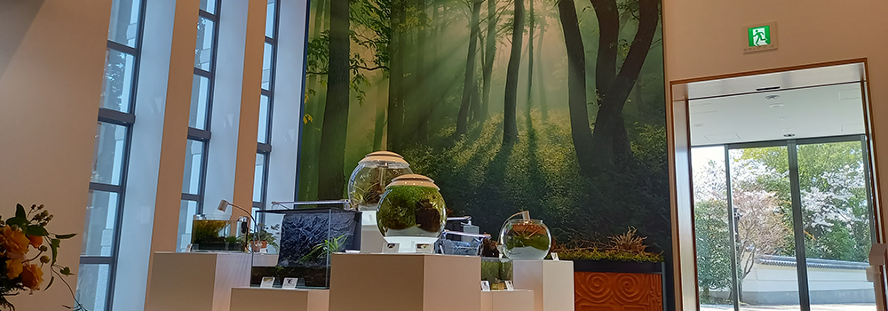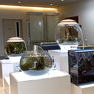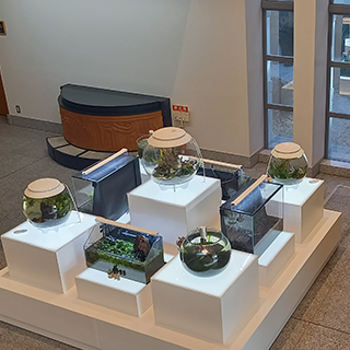 一つの飼育槽の中に水中部分や陸地部分、または混在させて動植物を飼育する、アクアテラリウムはバランスの良い生態系を作り維持することが重要です。ここでは、里山の水辺(淡水)を9台のアクアテラリウムで表現しており、メダカなどの強く育てた種は庭園に移し屋外飼育をおこなっています。