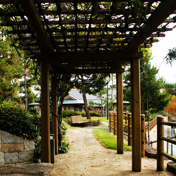 自然の風景を独自の伝統的な手法で再現し、和風庭園に仕上げております。 四季折々、移りゆく風景を凝縮させた庭園の姿は、眺める者に、穏やかさや大らかさを、そして厳しさ、やさしさを感じさせてくれます。あたらしい道の庭園では、風光明媚な景観にふれることができます。
